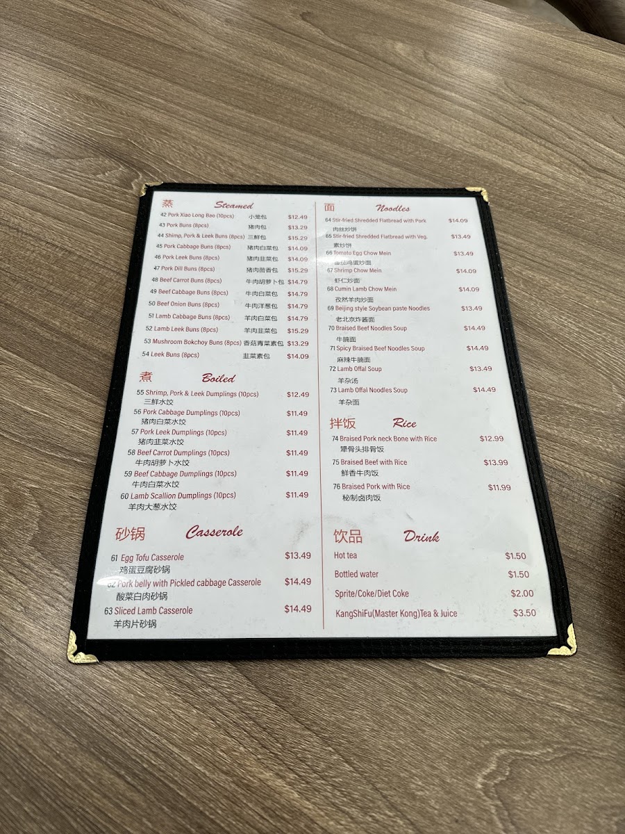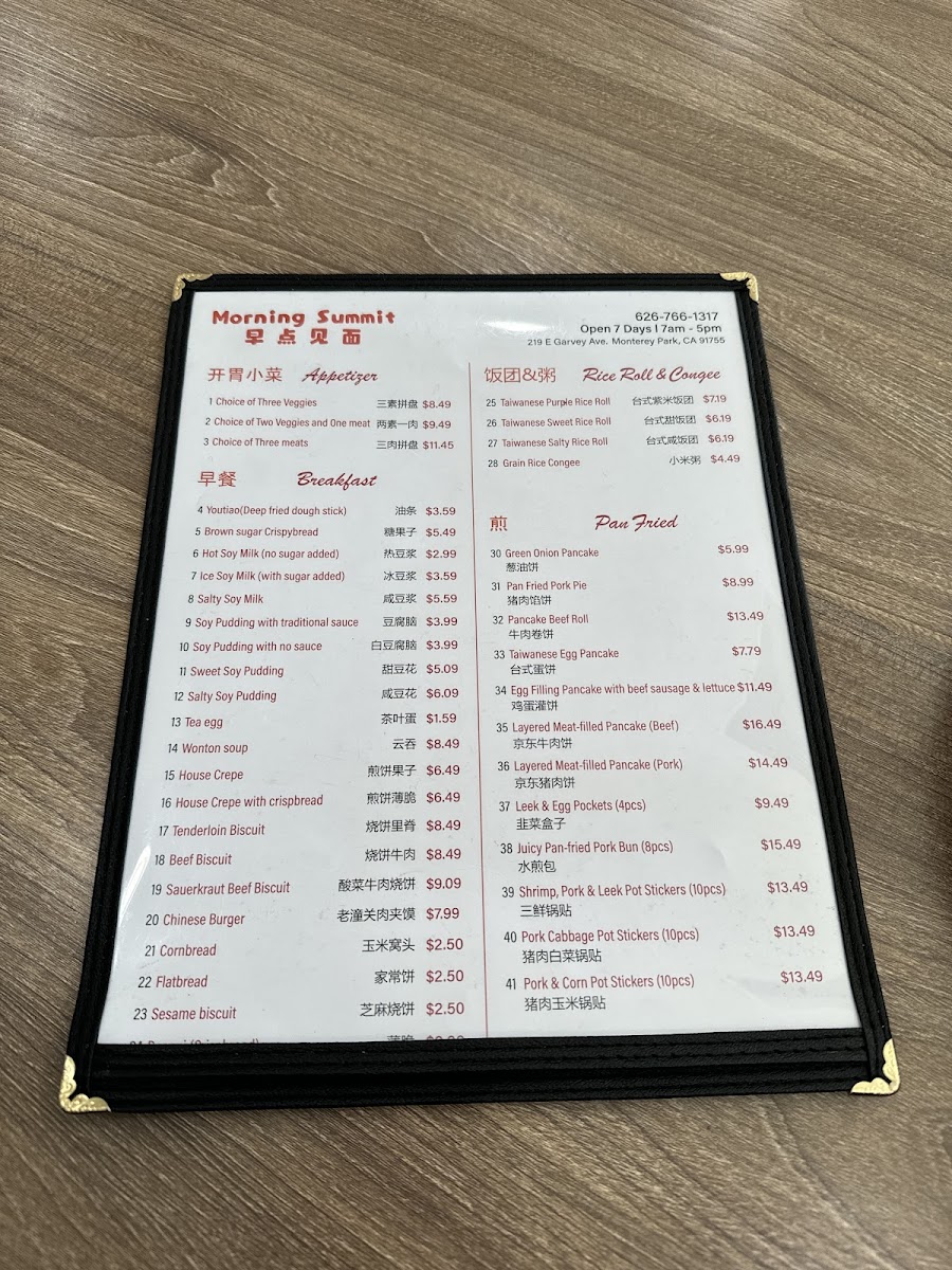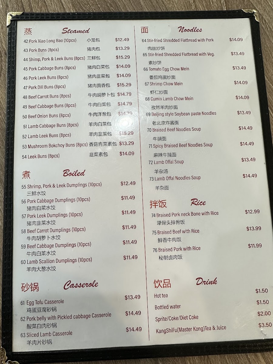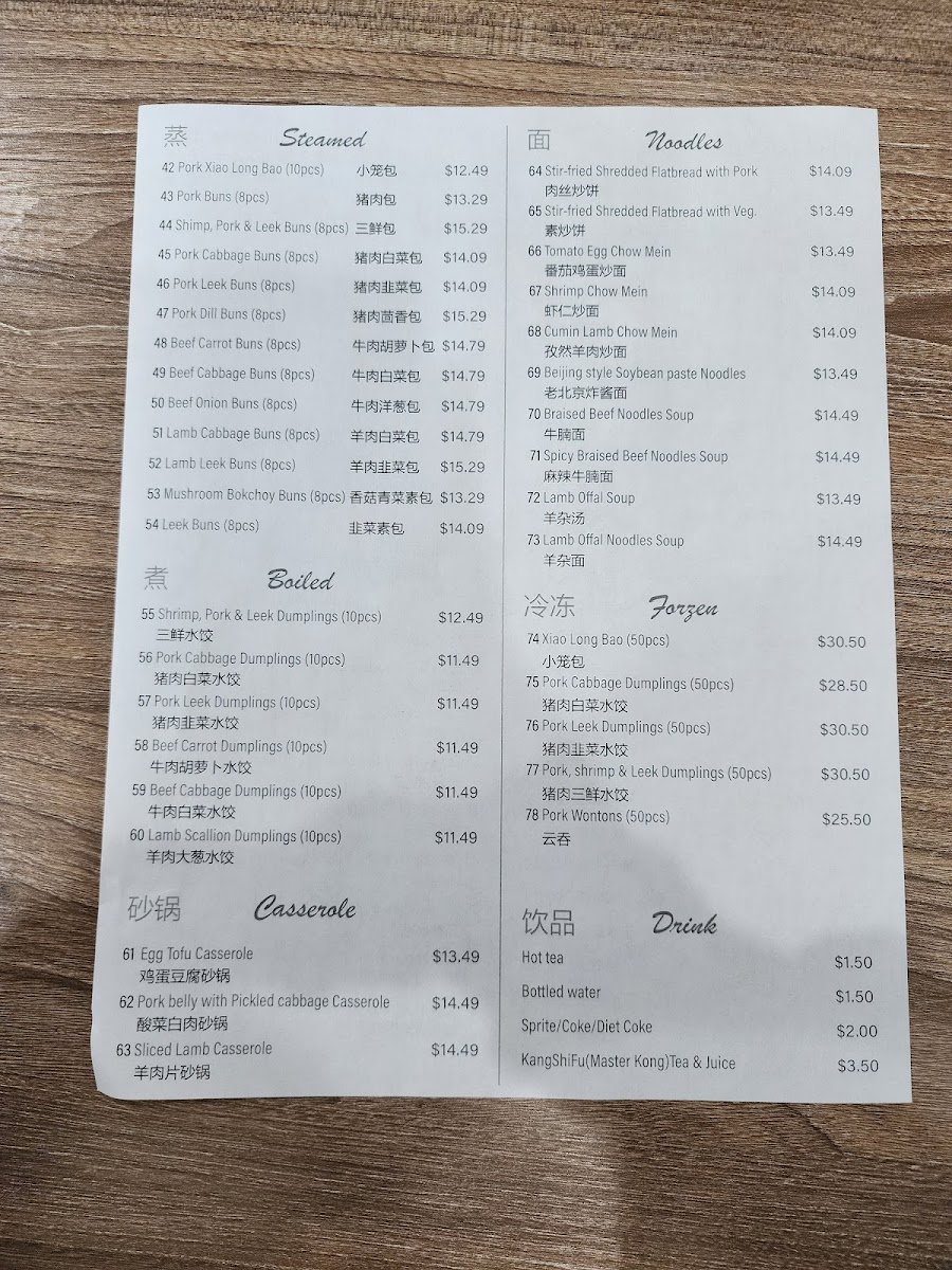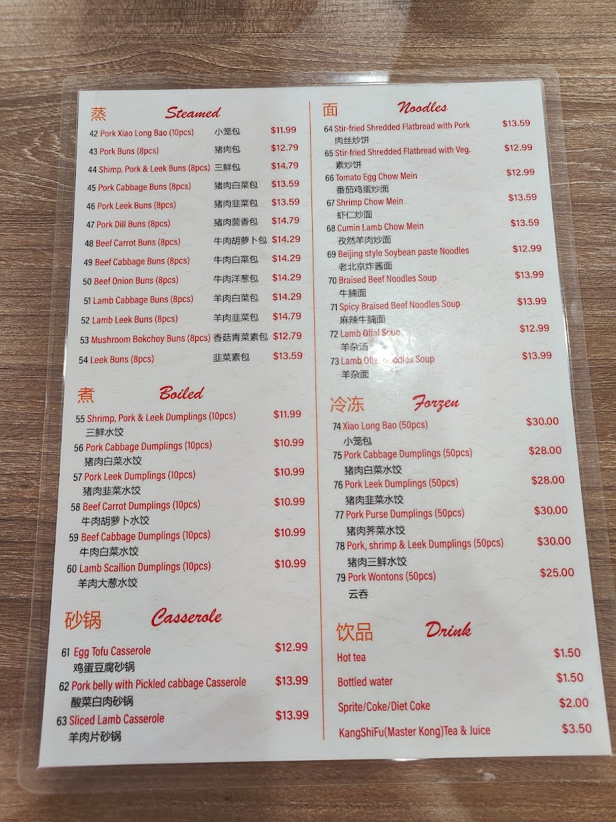 The menu at Morning Summit offers a wide variety of dishes that cater to diverse tastes, with an emphasis on comforting, traditional flavors. For drinks, guests can enjoy refreshing options like KSF Grape Juice ($3.50), Sprite ($1.50), and KSF Jasmine Green Tea ($2.50). The steamed bun section features a range of fillings, such as the savory Pork with Cabbage Bun ($6.99 for 8 pcs) and the flavorful Shrimp, Pork, Egg & Chive Bun ($7.99 for 8 pcs). Pan-fried items are equally tempting, with the Pancake Beef Roll ($5.99) and Layered Meat-Filled Beef Pancake ($6.99) standing out. For breakfast, the Soy Pudding with Pork Floss, Scallion & Pickled Mustard ($4.99) and Chicken Tenderloin Biscuits ($5.50) are both comforting and satisfying options. Noodles enthusiasts will find delight in the Beijing Style Noodles with Soy Bean Paste ($7.99) or the bold Spicy Braised Beef Noodles Soup ($8.50). The boiled dumplings are another crowd-pleaser, including the Lamb Scallion Dumplings ($7.50 for 10 pcs) and the Pork Cabbage Dumplings ($6.99 for 10 pcs). For those looking to take something home, the frozen dumplings, such as Pork Chive Dumplings ($12.99 for 50 pcs), provide an easy way to enjoy Morning Summit's flavors later. The casserole dishes like the Pork Belly with Pickled Cabbage Casserole ($12.99) and Sliced Lamb Casserole ($14.99) offer hearty, warming meals perfect for sharing. Overall, the menu delivers a satisfying mix of flavors, with each dish offering a taste of traditional comfort food at affordable prices.