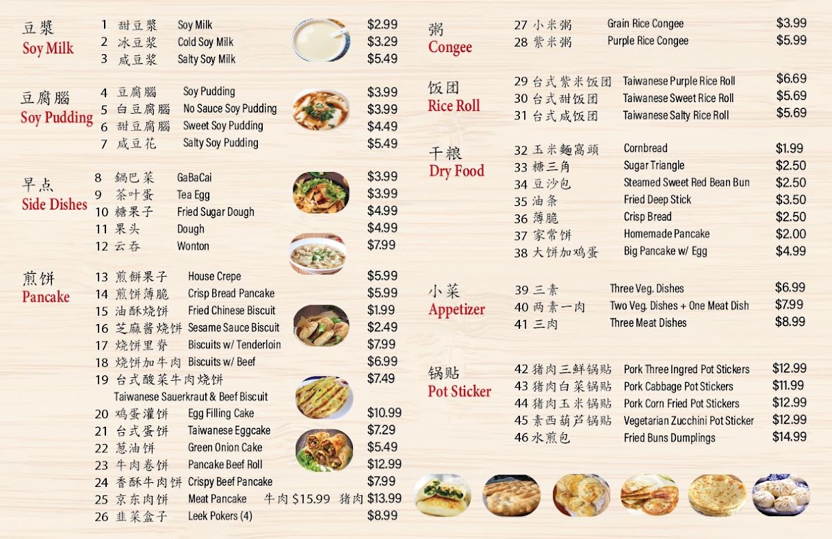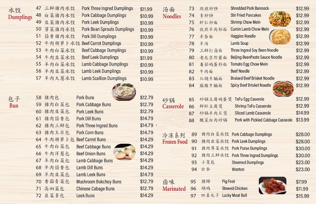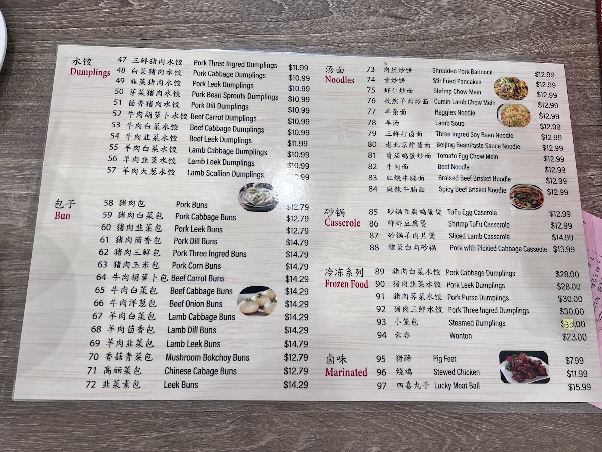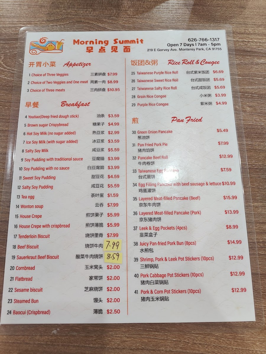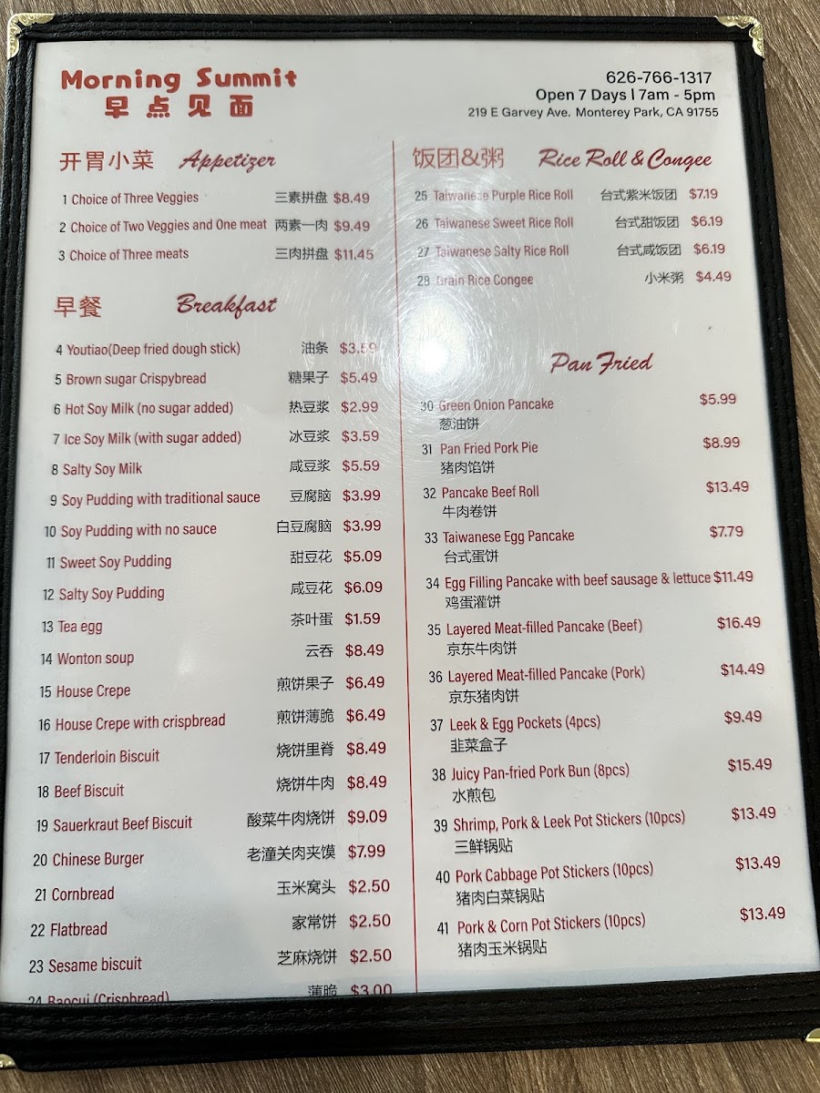 The menu at Morning Summit offers a wide variety of dishes that cater to diverse tastes, with an emphasis on comforting, traditional flavors. For drinks, guests can enjoy refreshing options like KSF Grape Juice ($3.50), Sprite ($1.50), and KSF Jasmine Green Tea ($2.50). The steamed bun section features a range of fillings, such as the savory Pork with Cabbage Bun ($6.99 for 8 pcs) and the flavorful Shrimp, Pork, Egg & Chive Bun ($7.99 for 8 pcs). Pan-fried items are equally tempting, with the Pancake Beef Roll ($5.99) and Layered Meat-Filled Beef Pancake ($6.99) standing out. For breakfast, the Soy Pudding with Pork Floss, Scallion & Pickled Mustard ($4.99) and Chicken Tenderloin Biscuits ($5.50) are both comforting and satisfying options. Noodles enthusiasts will find delight in the Beijing Style Noodles with Soy Bean Paste ($7.99) or the bold Spicy Braised Beef Noodles Soup ($8.50). The boiled dumplings are another crowd-pleaser, including the Lamb Scallion Dumplings ($7.50 for 10 pcs) and the Pork Cabbage Dumplings ($6.99 for 10 pcs). For those looking to take something home, the frozen dumplings, such as Pork Chive Dumplings ($12.99 for 50 pcs), provide an easy way to enjoy Morning Summit's flavors later. The casserole dishes like the Pork Belly with Pickled Cabbage Casserole ($12.99) and Sliced Lamb Casserole ($14.99) offer hearty, warming meals perfect for sharing. Overall, the menu delivers a satisfying mix of flavors, with each dish offering a taste of traditional comfort food at affordable prices.